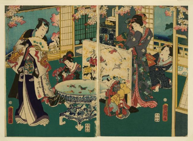 Woodcut Print 'Flower Performance' by Toyohara, Kunichika, 1862