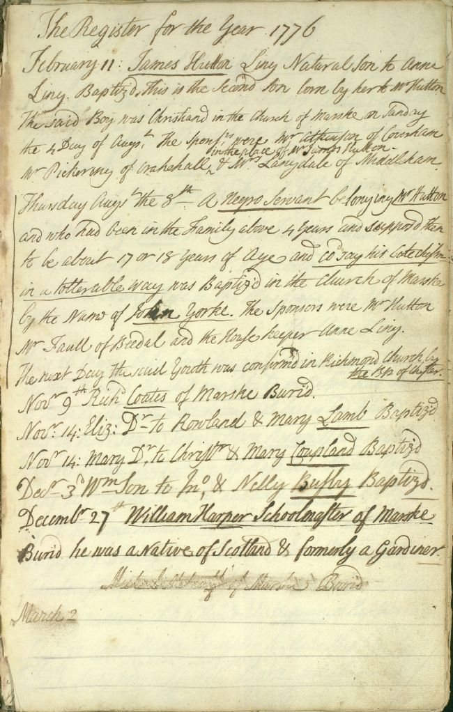 Handwritten record of the baptism of John Yorke, dated 1776. The entry reads: 'Thursday Aug the 8th - a Negro Servant belonging Mr Hutton and who had been in the family above 4 years and supposed then to be about 17 or 18 years of age and co'd say his Catechism in a tollerable way was Baptized in the Church of Marske by the name of John Yorke. The Sponsors were Mr Hutton, Mr Faull of Beedal and the Housekeeper Anne Liny. The next day the said Youth was confirmed in Richmond Church by the Bishop of Chester'.