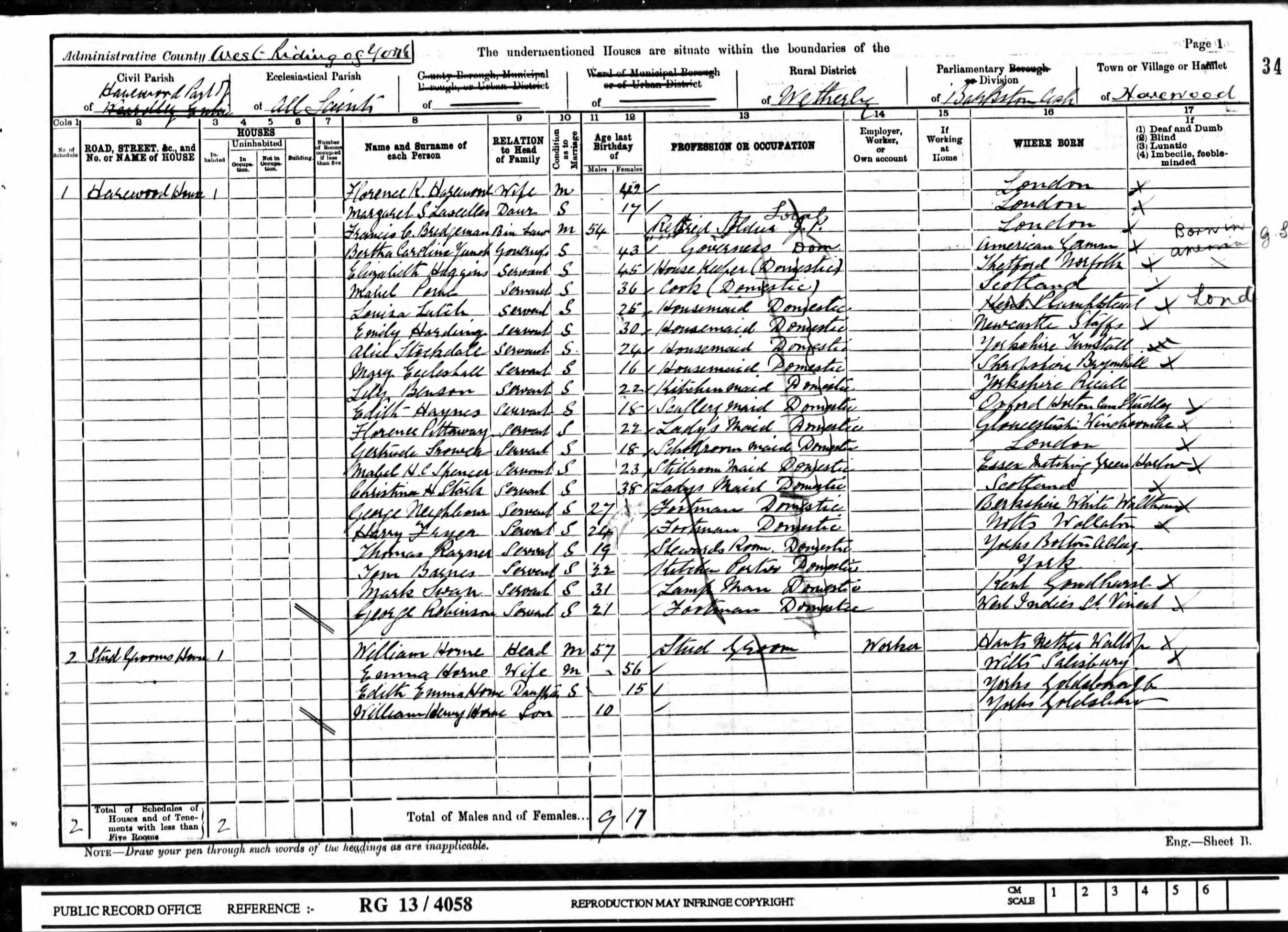 This copy of the 1901 census document for Harewood House in the West Riding of York lists 'George Robinson' as a servant. Census records are a primary historical source that can be invaluable for researchers.
