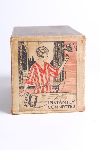 An image from the box of a 1920s electric iron. It shows how many homes were now using electricity to make the lives of their inhabitants easier.