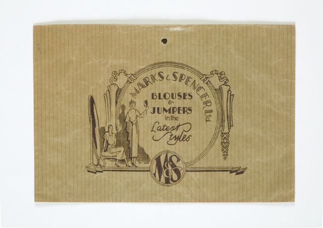 1930s M&S paper bag. At this time M&S were selling luxury goods alongside their core homewares. They wanted to provide customers with high-quality, beautifully designed goods that enhanced their lives. This illustrated paper bag features art deco designs and conveys a message of elegance and sophistication
