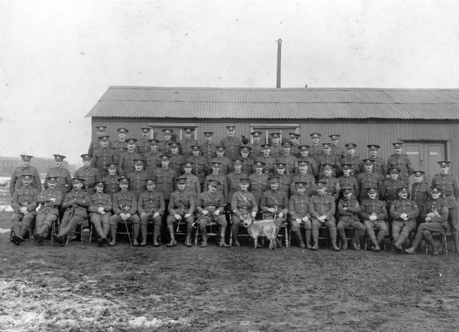 This photograph, taken in February 1916, shows Senior NCOs of the 15th (service) Battalion (1st Leeds) The Prince of Wales's Own (West Yorkshire Regiment), known as the 'Leeds Pals'. The soldiers are grouped outside the Sergeants' Mess. A chicken perches on the head of one of the Senior NCOs, while the regimental pet goat poses in the centre. The Colour Sergeant at the right edge is nursing a cat