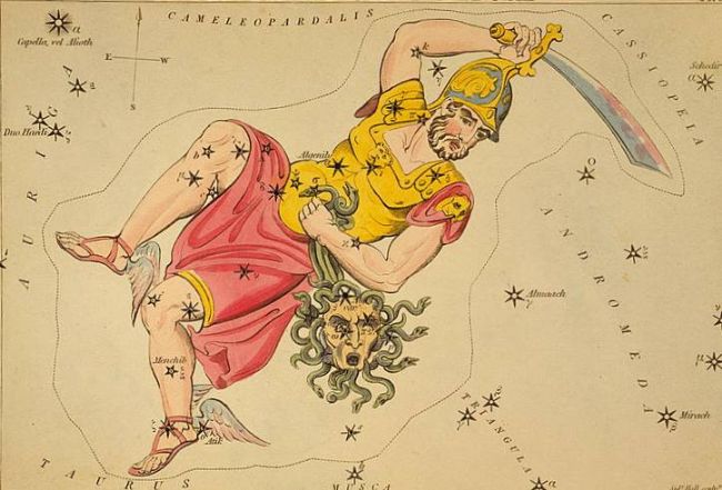 Some characters from Greek mythology were thought to become part of the constellation when they died. Here is an illustration of Perseus carrying Medusa's severed head, showing their place in the stars.