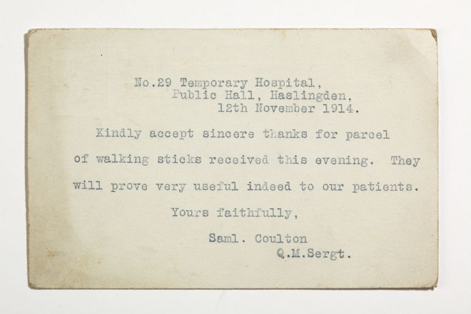 Ada Whiteside sent the walking sticks to hospitals all around Preston and Lancashire during the First World War. This letter from a grateful Quartermaster at a temporary hospital in Haslingden expresses thanks for his walking stick.