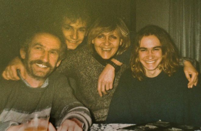 Maciek (right) with his father, brother and mother at their home in Poland, taken around 2000