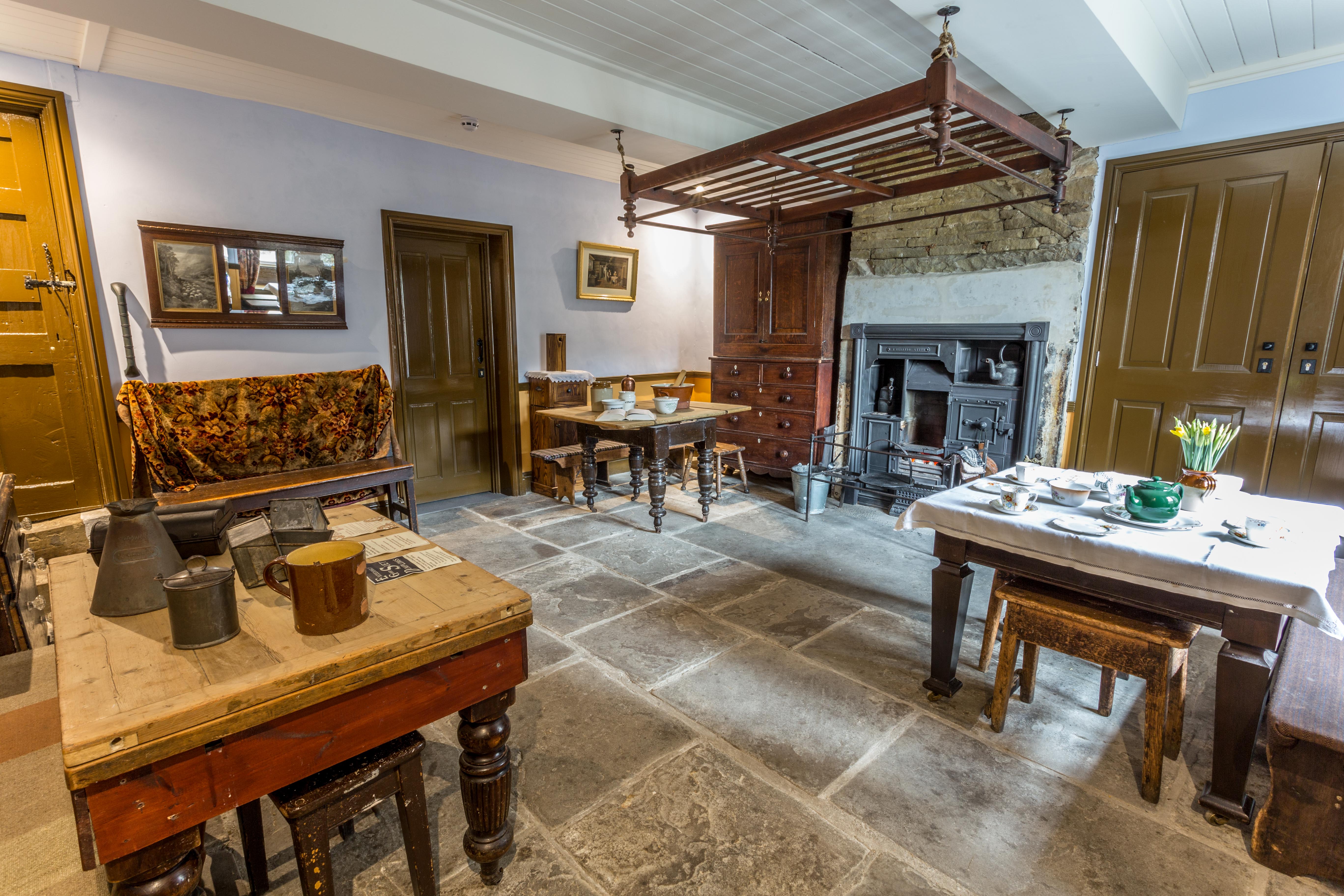 The kitchen of a Victorian worker's home. The stone flag floor would have been cold and so the family would have made rag rugs to cover some of the floor. The black kitchen range is the only source of heat for the whole house. Note the flake rack hanging from the ceiling in front of the range. This is where havercakes would be hung to dry.