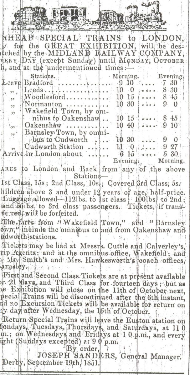 Advertisment for cheap rail fares to London to see the Great Exhibition. Huddersfield Weekly Examiner September 19th 1851.