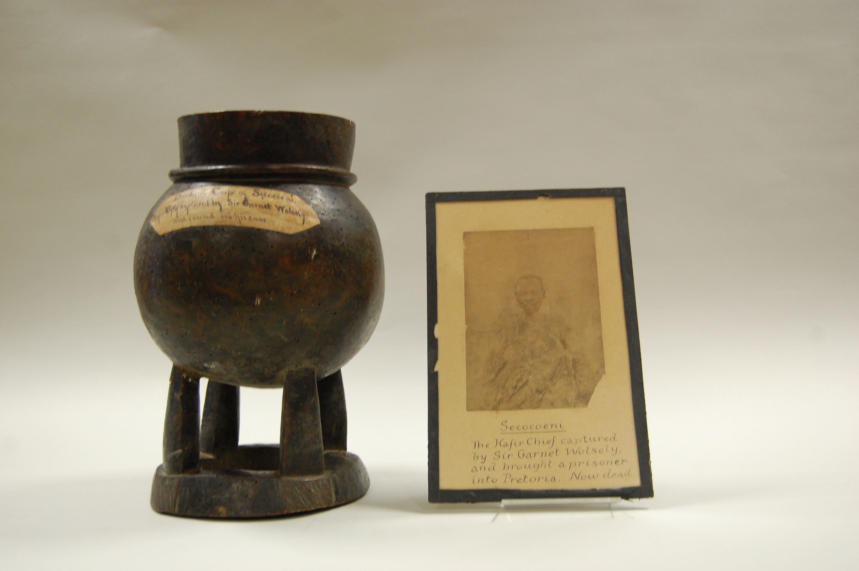 This large wooden drinking cup belonged to a chief called Sekhukhuni (also commonly spelled Sekhukhune) who ruled in southern Africa. In 1881 Sekhukhuni was captured by a British soldier, Sir Garnet Wolsey, and was photographed shortly after. Wolsely presented the cup and photograph to a local museum after his retirement to Dorset, England (The Red House Museum at Christchurch), and Leeds acquired the two items as a transfer in 2009.