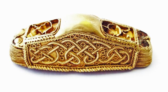 This Anglo Saxon decorative sword pommel dates from the 7th Century AD (about 600 – 650 AD). The pommel was the small decorative knob at the top of the sword handle.