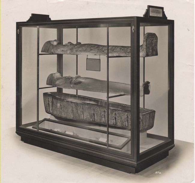 This case was made in 1931-2 and was the case Nesyamun was in when the bomb hit the museum. The blast from the bomb punched directly through the large sheets of plate glass, but Nesyamun and coffins were left mostly unscathed (although there was some damage).