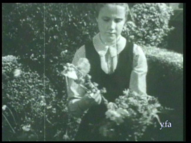 Still from film of young girl tending flowers in the family garden in the 1950s. Note: Because this is a film still, the print quality of this image is likely to be low.