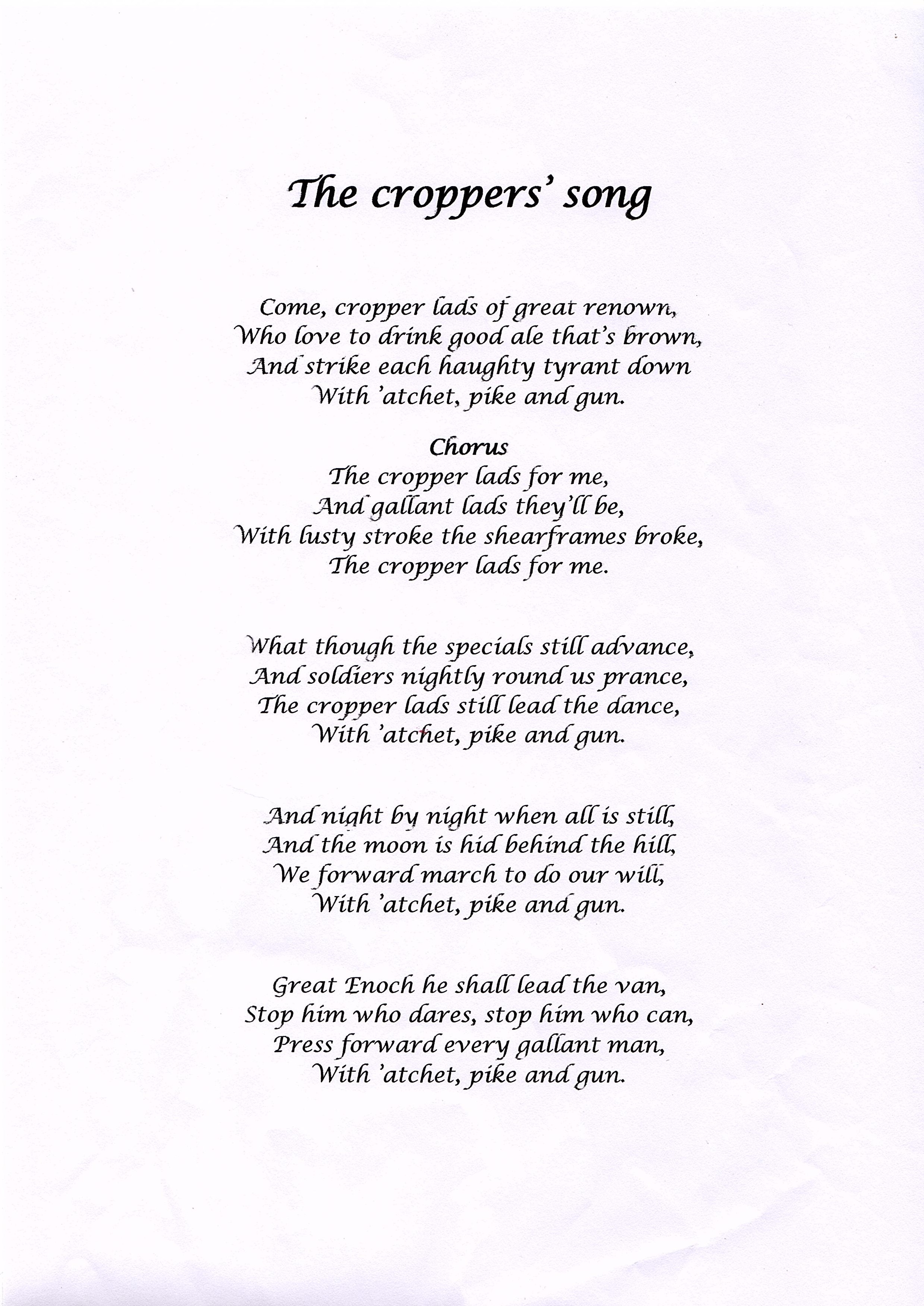 The Cropper Song describes how the Luddites would destroy the mill machinery at night, to try to prevent the loss of their highly skilled jobs.