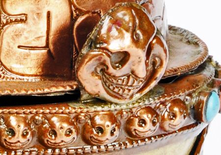 Detail of a Tibetan skull cup. One of the three larger skull heads that project above the cup rim. One of these heads is now missing. These skull heads are common features on Himalayan ritual masks and sacred implements. They are a reminder of the power of wrathful deities to combat negative forces.