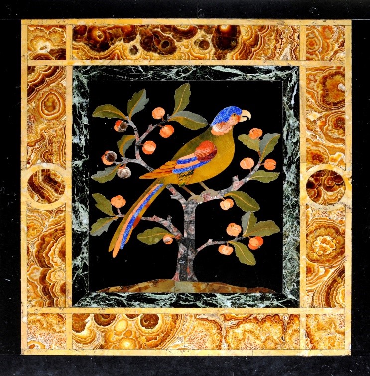 A marble table top decorated with exotic birds. Designed by William Burges in 1867.