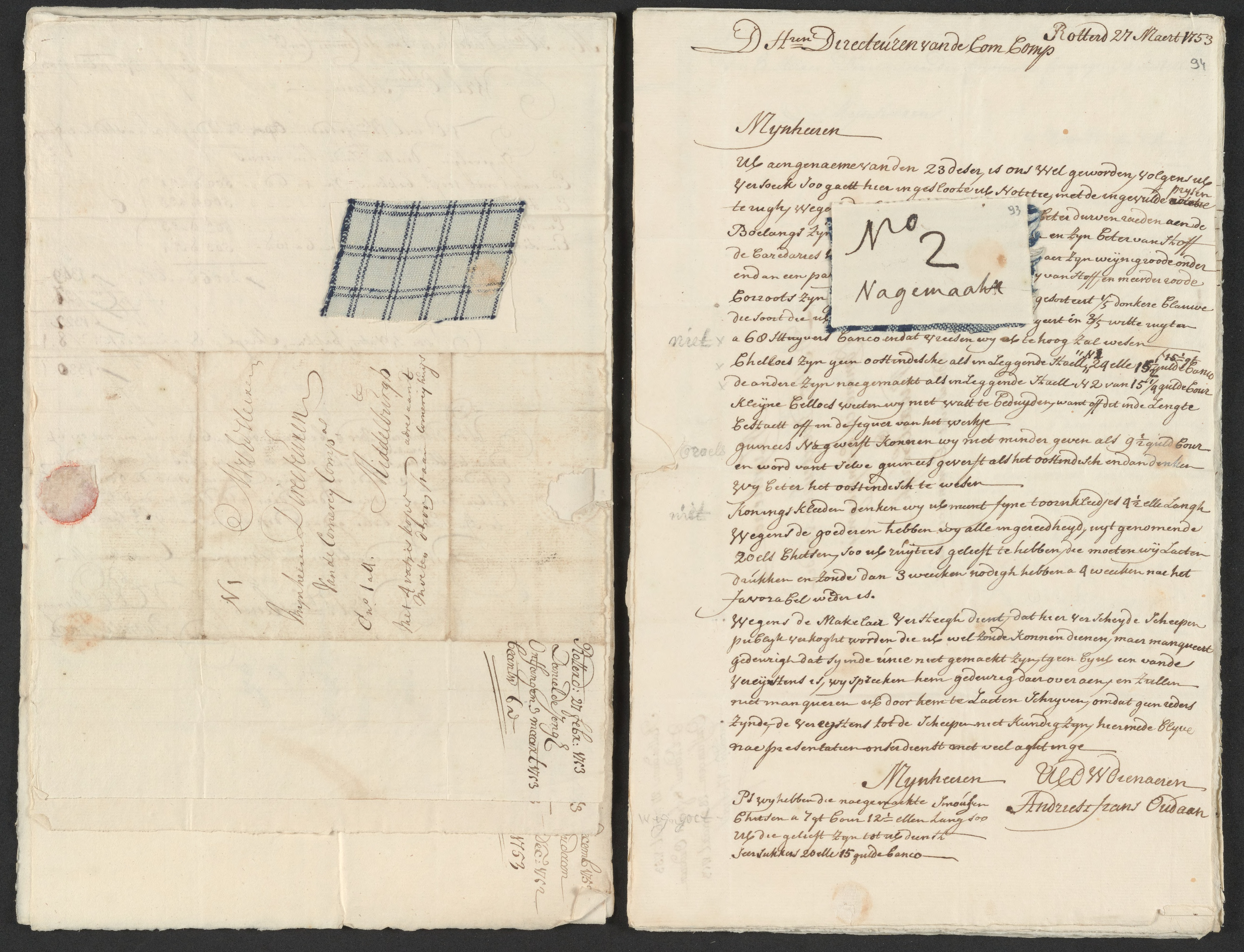 Dutch company ledger, 20 Middelburg Commerce Company (MCC), 1720-1889, showing textile used for trade.