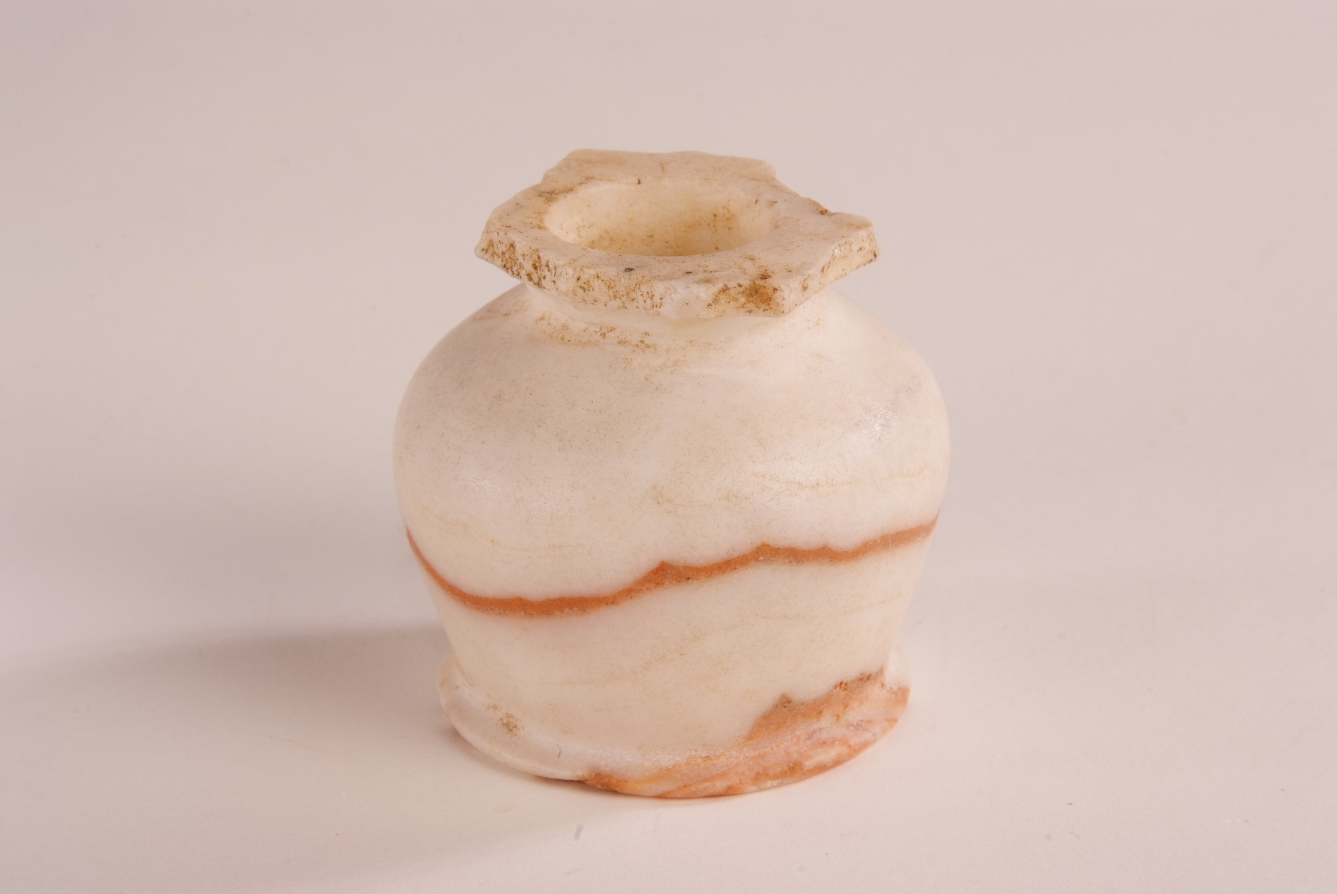 This Kohl (eye make-up) pot was used to store the eye make-up that all Egyptians wore to protect their eyes from ailments, flies and the harsh glare of the sun. It was made with black lead ore galena. This pot is made from calcite, which is the main constituent of marble. It dates c.1800 BCE. The rim is broken.