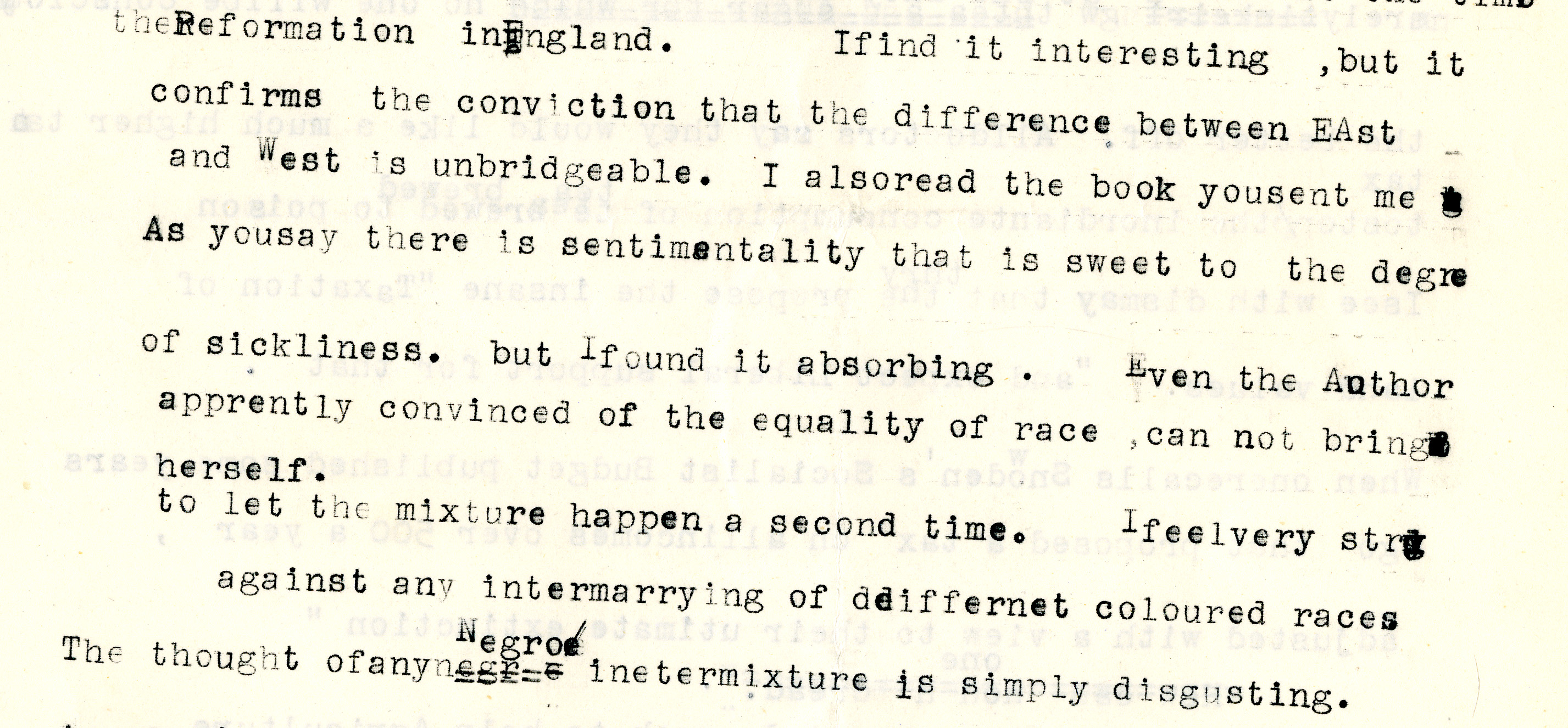 "I also read that book you sent me. As you say there is sentimentality that is sweet to the degree [sic] of sickliness. But I found it absorbing. Even the Author apparently convinced of the equality of race can not bring herself to let the mixture happen a second time. I feel very strongly [sic] against any intermarrying of different coloured races. The thought of any Negro intermixture is simply disgusting”.