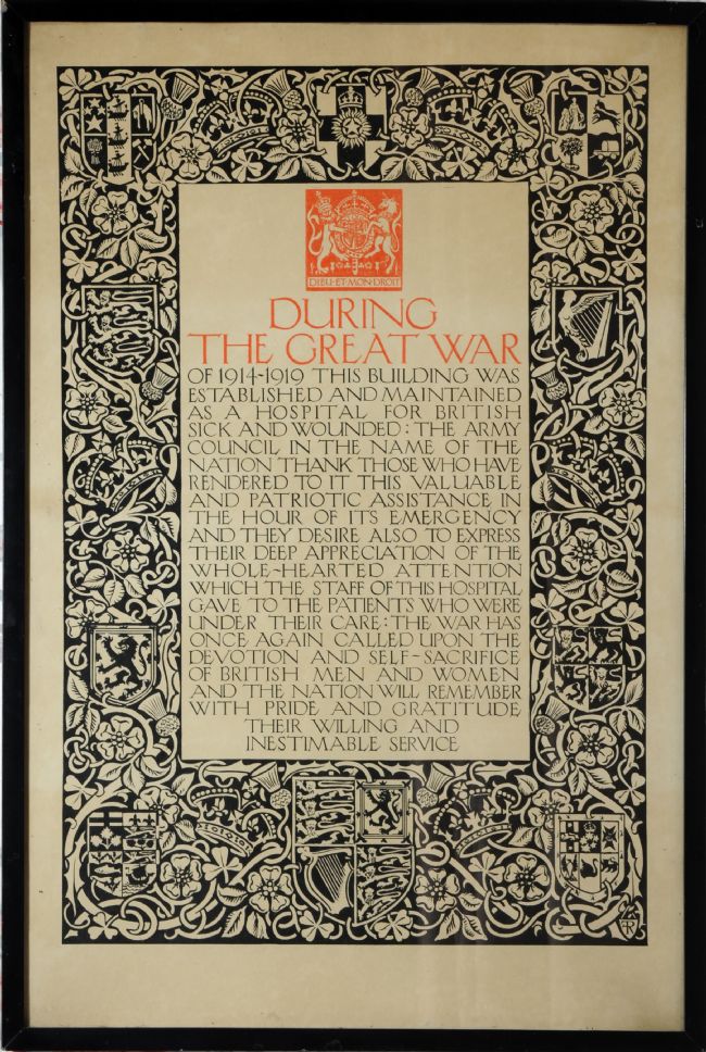 Great War Hospital Certificate awarded to the owners of Lotherton Hall to recognise their contribution to the war effort in donating their house for use as a temporary hospital.