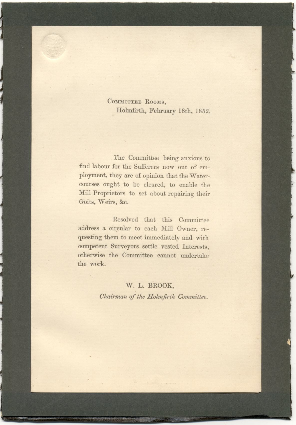 A minute from the Holmfirth Committee, resolving to send a circular to local mill owners, with a view to providing work for sufferers of the 1852 Holmfirth Flood.