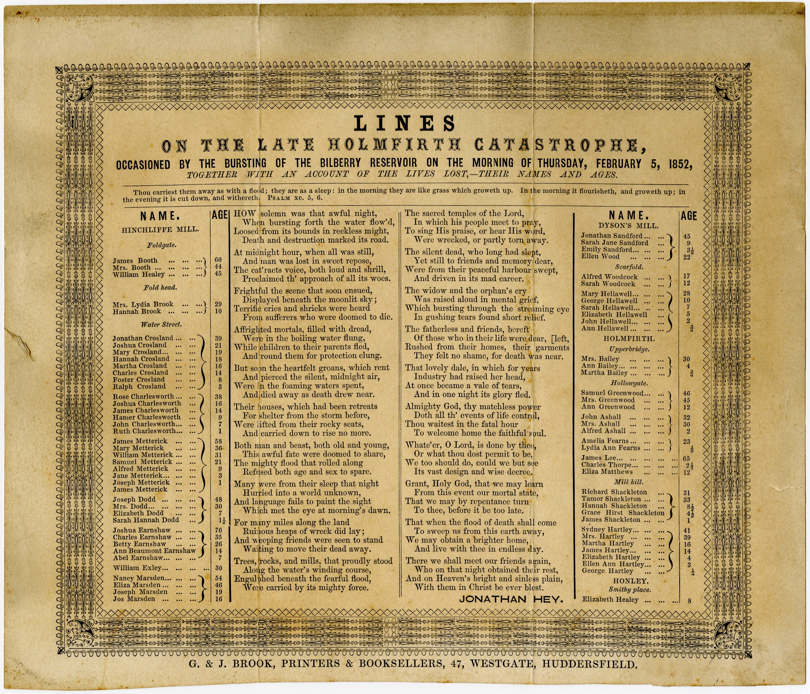 A printed poem entitled 'Lines on the Late Holmfirth Catastrophe. . . Together with an Account of the Lives Lost - their Names and Ages', by Jonathan Hey; commemorating the Holmfirth flood of February 1852.