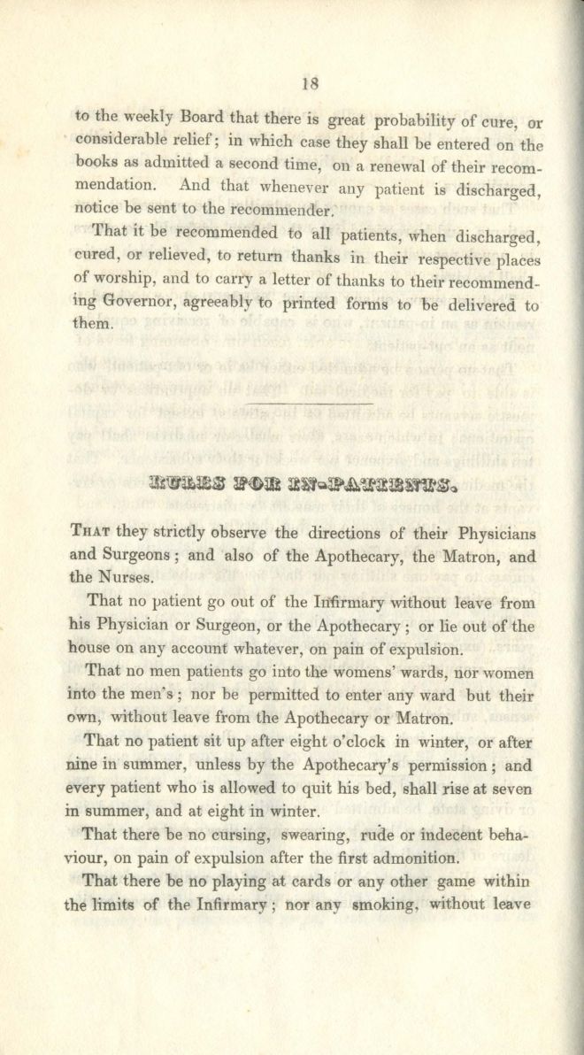 Rules for In-Patients taken from the 1862 Huddersfield and Upper Agbrigg Infirmary Rules and Annual Report