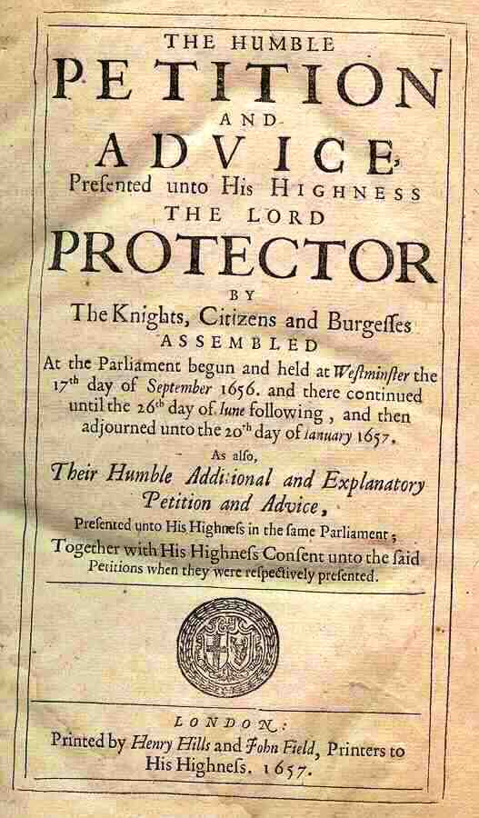 In 1657 Parliament revised the constitution in a new document entitled ‘the Humble Petition and Advice’. This document offered Cromwell the crown.