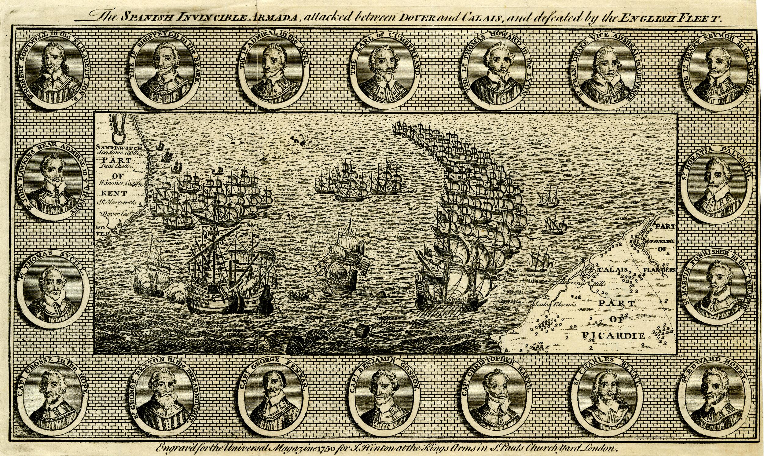 Engraving of the Spanish Armada sighted off the French coast being attacked by the English fleet. The central image is surrounded by 18 portrait medallions of the English admirals and captains.