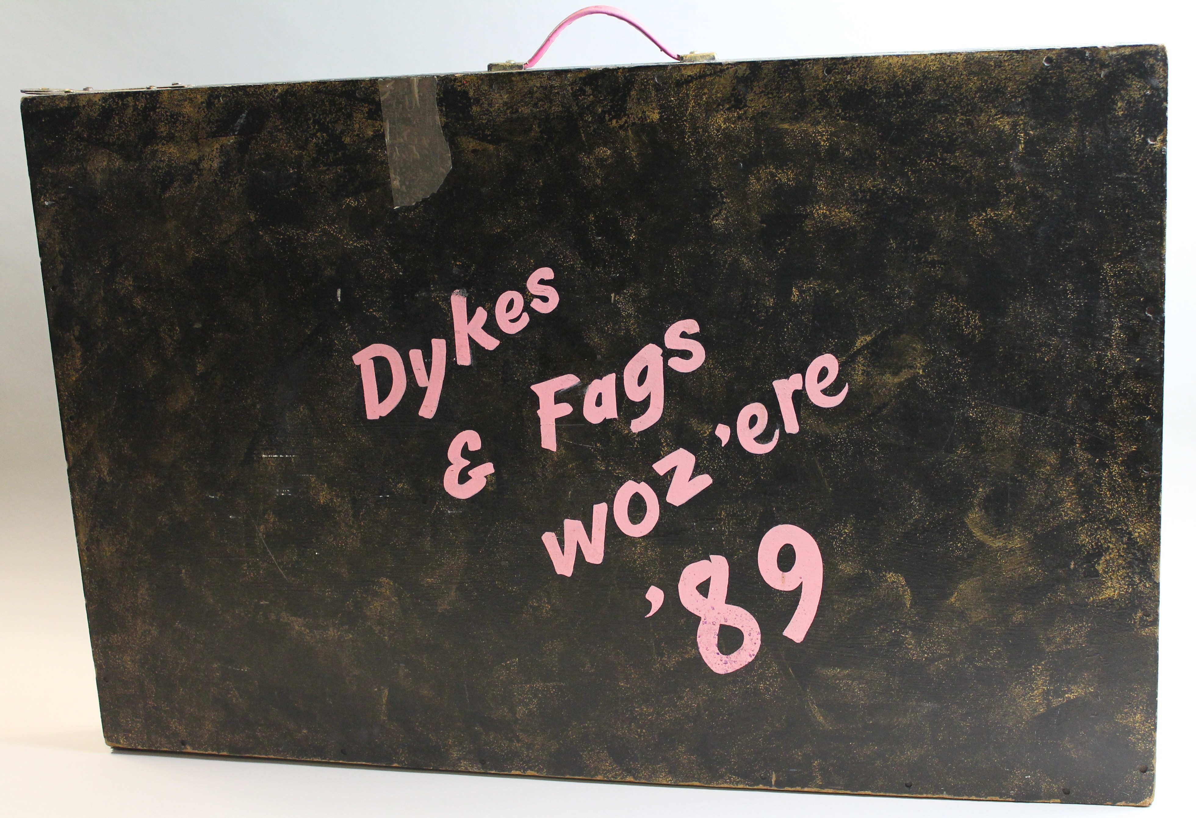 The back of the Intentional Promotions pasting table. The labels ‘dykes’ for lesbians and ‘fags’ for gay men were derogatory terms but in using them themselves, the Leeds University Lesbian and Gay Society sought to reclaim them as positives.