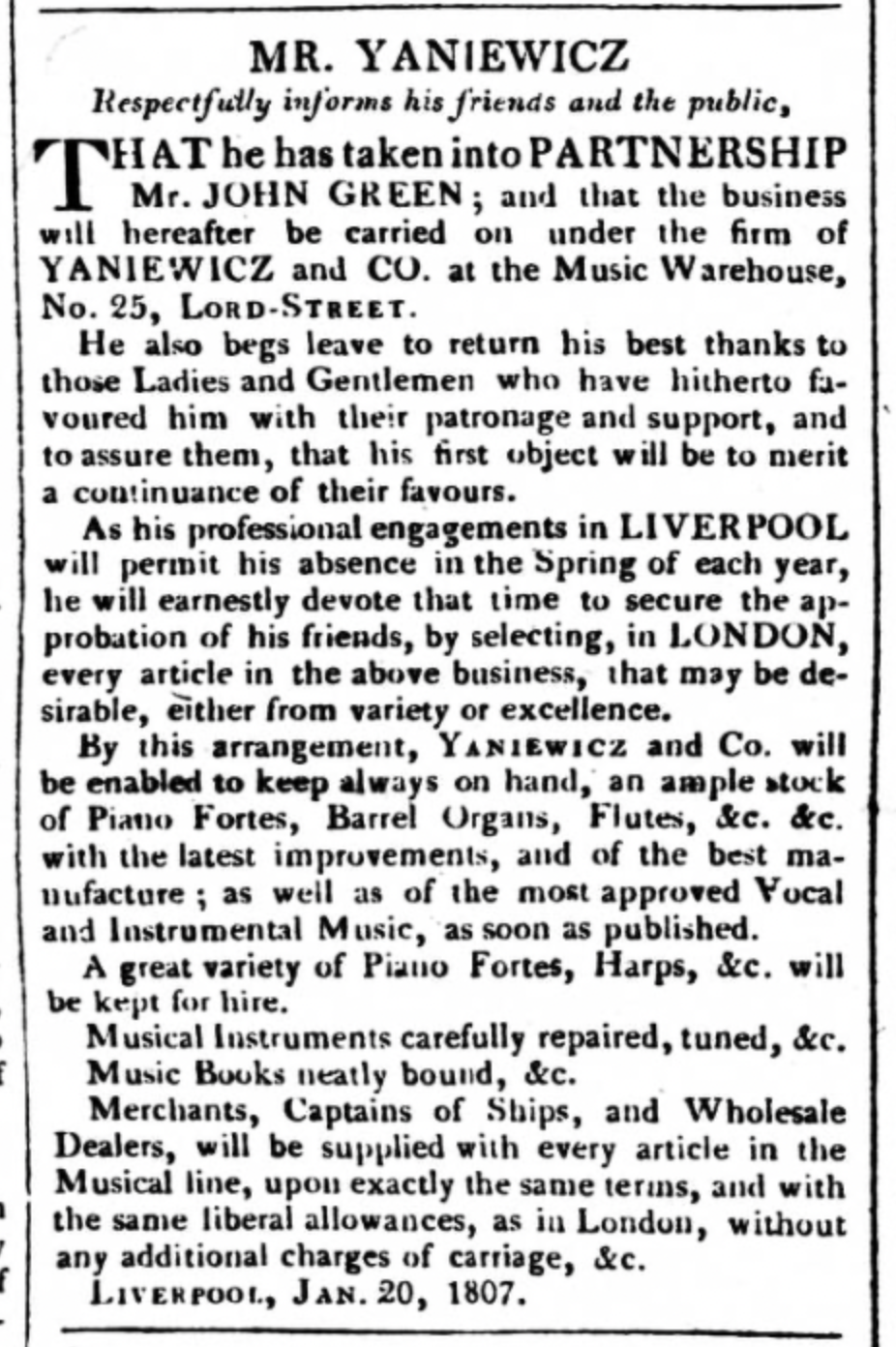 A newspaper article from the Lancaster Gazette, Saturday 7 February 1807. The article announces the business partnership between Felix Yaniewicz and John Green concerning their music shop/warehouse in Lord Street, Liverpool.