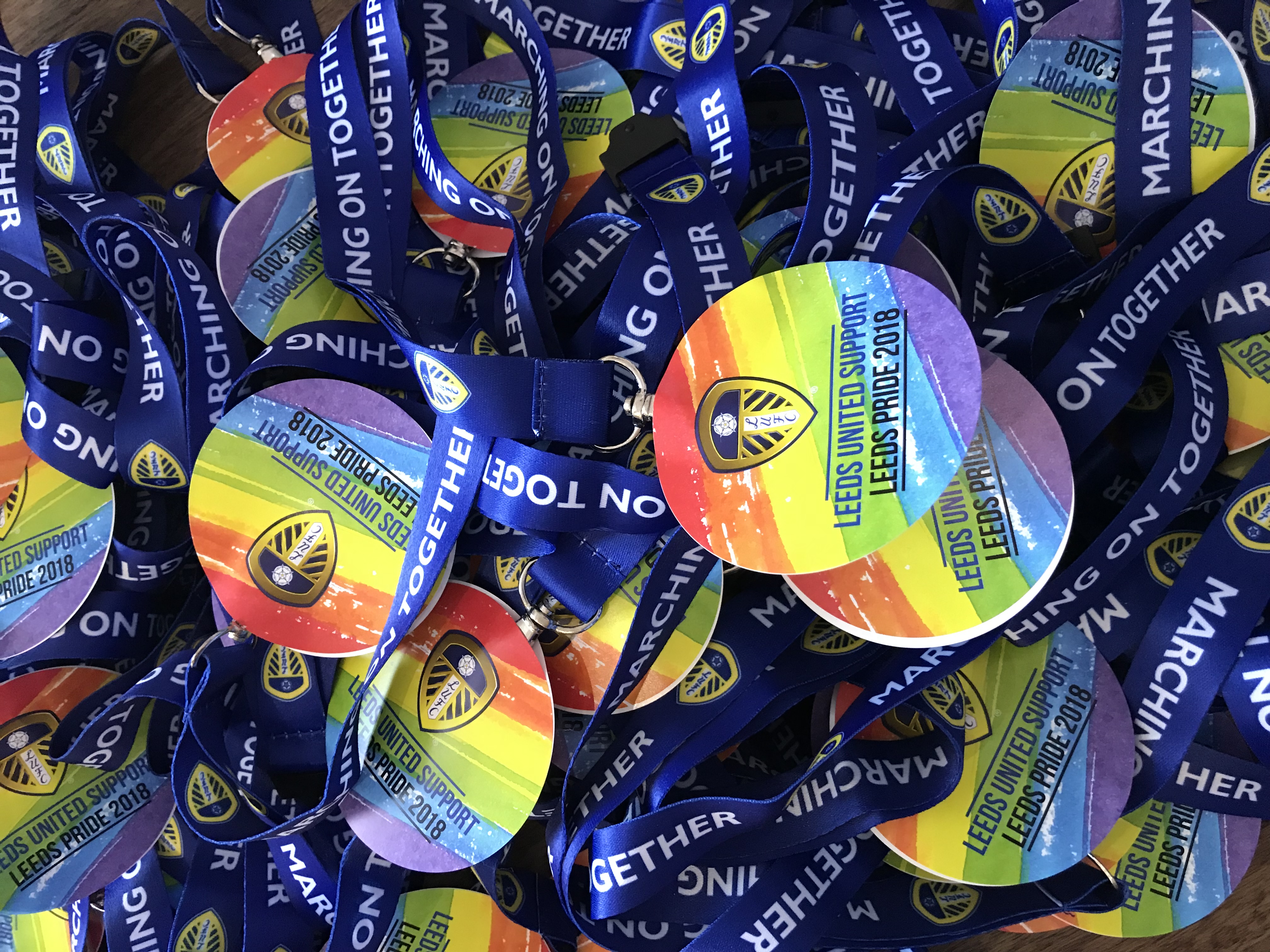 Official Leeds United Pride lanyards, advertising the club's support for the LGBT+ community.