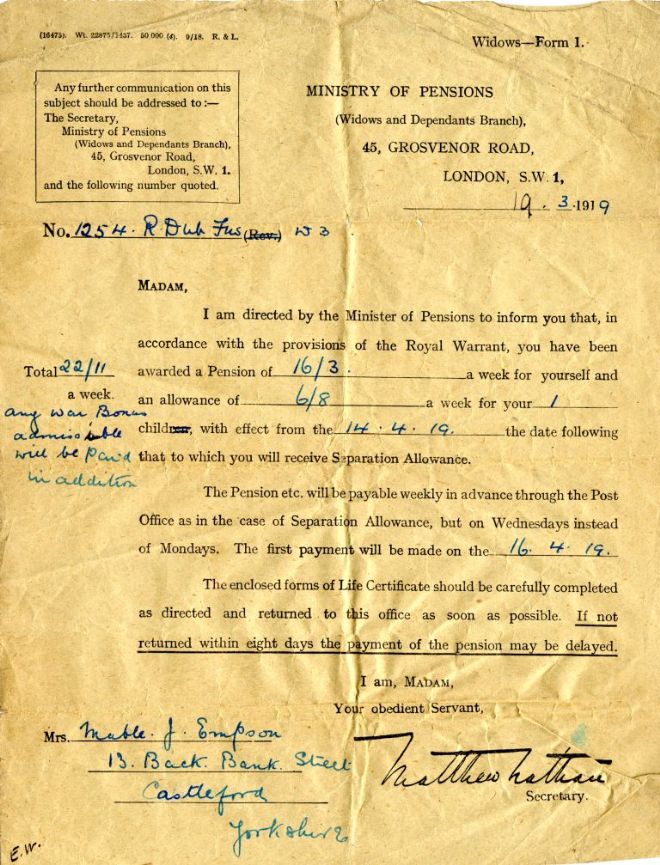 Letter to War Widow Mabel Empson from the Ministry of Pensions
