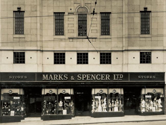 Leeds Briggate Store 1934. In 1909 M&S opened a store at 76 Briggate. After the First World War the store was rebuilt. The 1920s and 30s were a time of great expansion for the business; prices now ranged from a penny up to five shillings and the wide selection of goods was streamlined. By the 1930s clothing and food were the largest departments © M&S Company Archive
