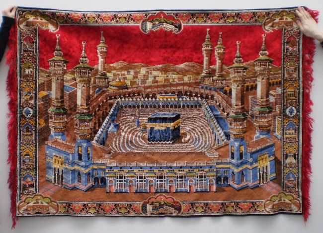 A printed wall cloth from Saudi Arabia featuring the Masjid al-Haram mosque at Mecca. It shows pilgrims circling the Kaa’ba stone. This acrylic velvet cloth was bought by Rozama Bibi (who was from Bradford) as a souvenir of her pilgrimage to Mecca in 1985. She visited other Hajj pilgrimage sites as well, such as Mina, Muzdalifah and Arafat. These sites are shown in the border. Image: © Leeds Museums and Galleries