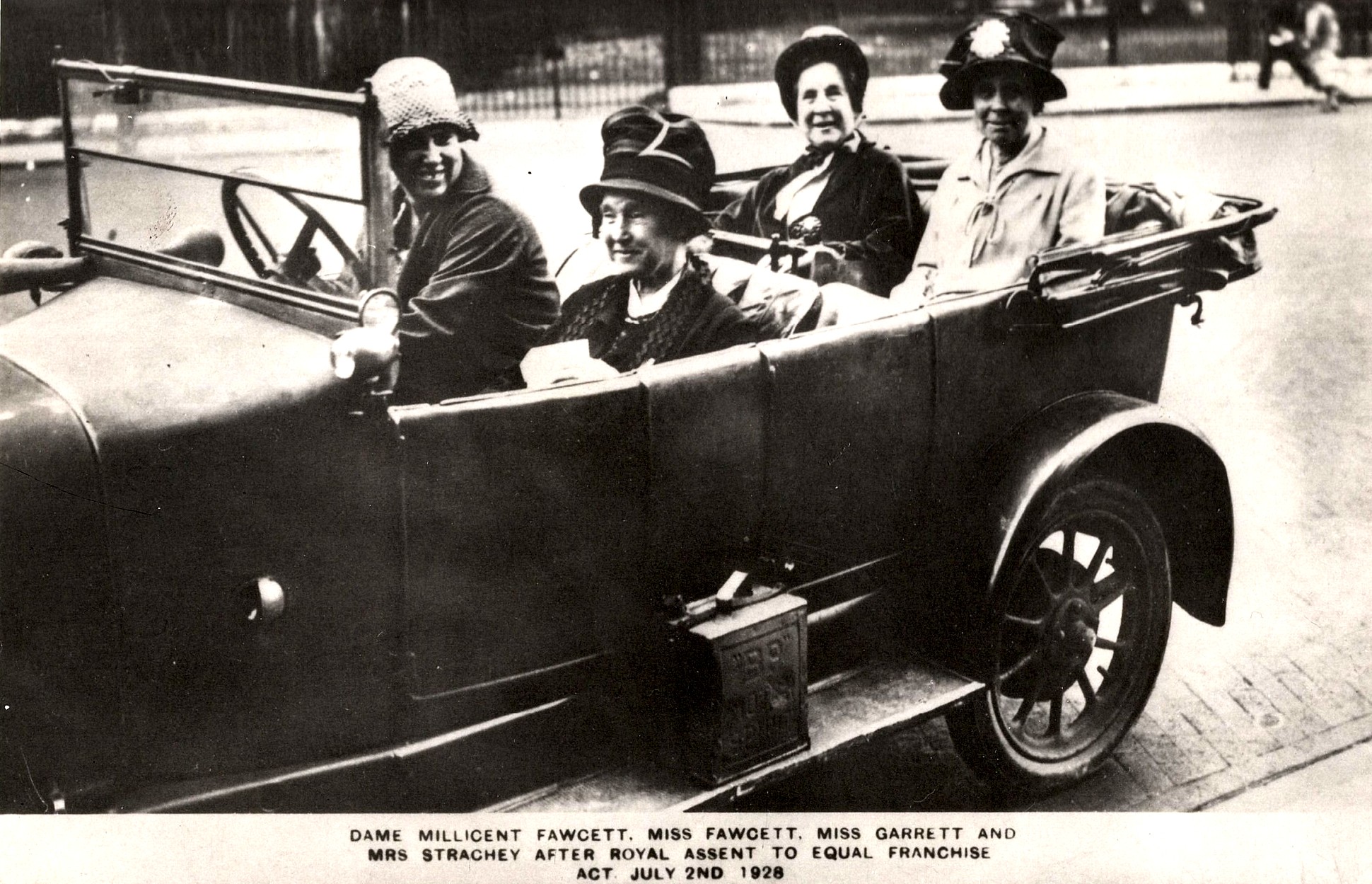 Photograph showing Millicent in a car with her daughter Philippa, friend and fellow campaigner, Ray Strachey and sister, Agnes Garrett, after the vote had passed in 1928