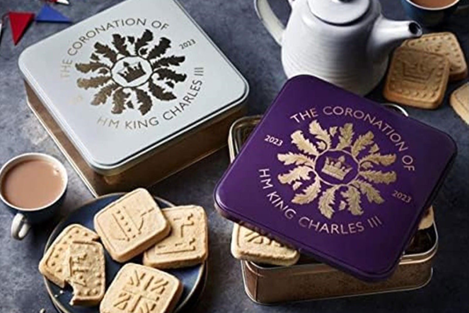 Biscuit tins designed to mark the coronation of King Charles III of England.