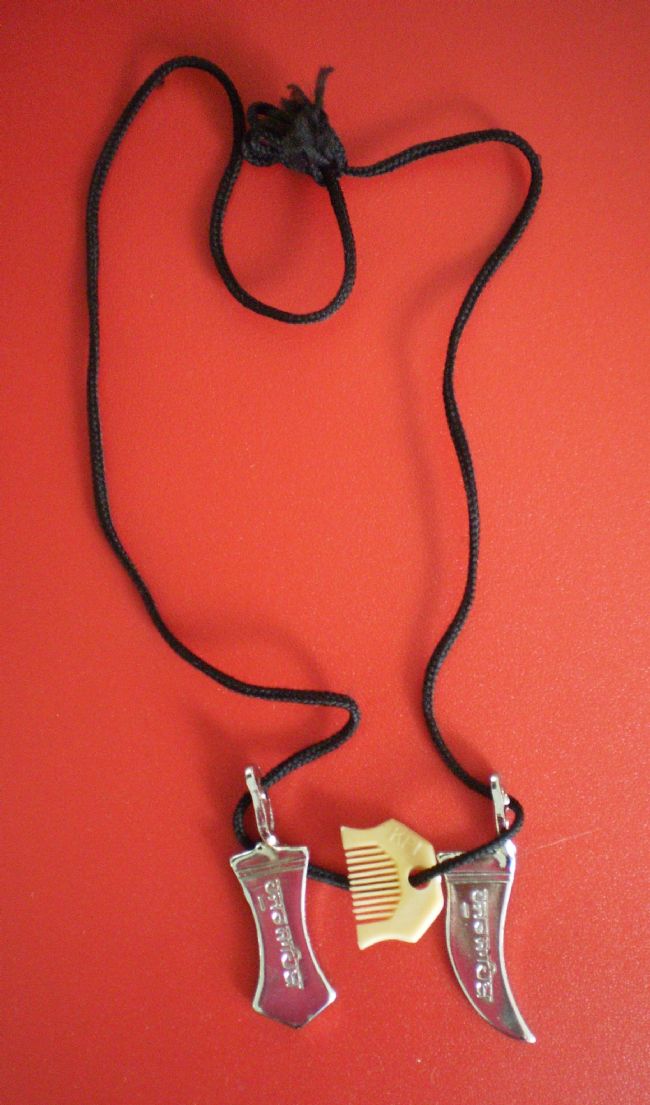 Necklace with three Sikh emblems, India, circa. 2000. Two different forms of Sikh knives, a single-sided curved kirpan blade, and a double-sided more spade-shaped knife, hand on this neck cord. The third emblem is pale wood coloured plastic comb. The miniature knives have Gurmukhi script inscriptions. Worn round the neck by Sikhs in place of full-sized kirpan knives and kanga combs, as part of the wearing of the 5 K’s. © Leeds Museums and Galleries