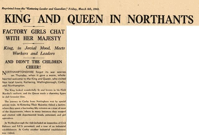 Newspaper cutting about the visit of the King and Queen to Northamptonshire. The royal visits were used to boost morale during WW2.