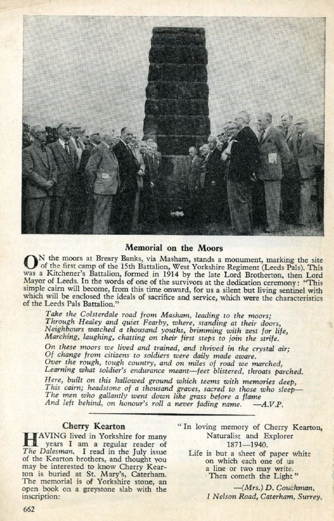Cutting from the Dalesman magazine, c.1969-70, headlined 'Memorial on the Moors,' with a photograph of surviving members of the Leeds Pals, 15th Battalion, West Yorkshire Regiment, with the new memorial erected near their former training camp at Masham