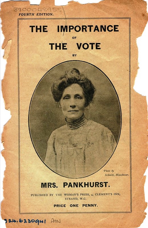 Pamphlet by Emmeline Pankhurst, including a portrait photograph of her on the cover