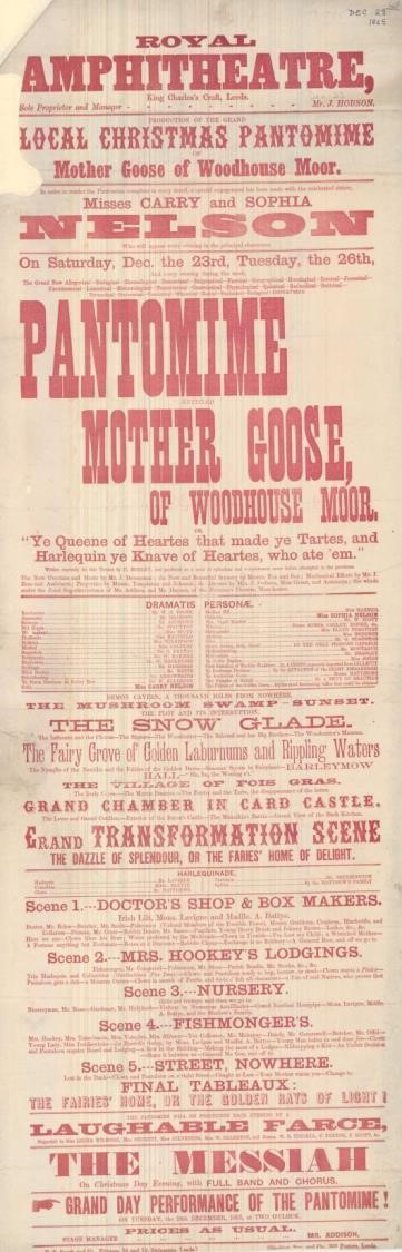 Playbill for Mother Goose pantomime at the Royal Amphitheatre in Leeds.