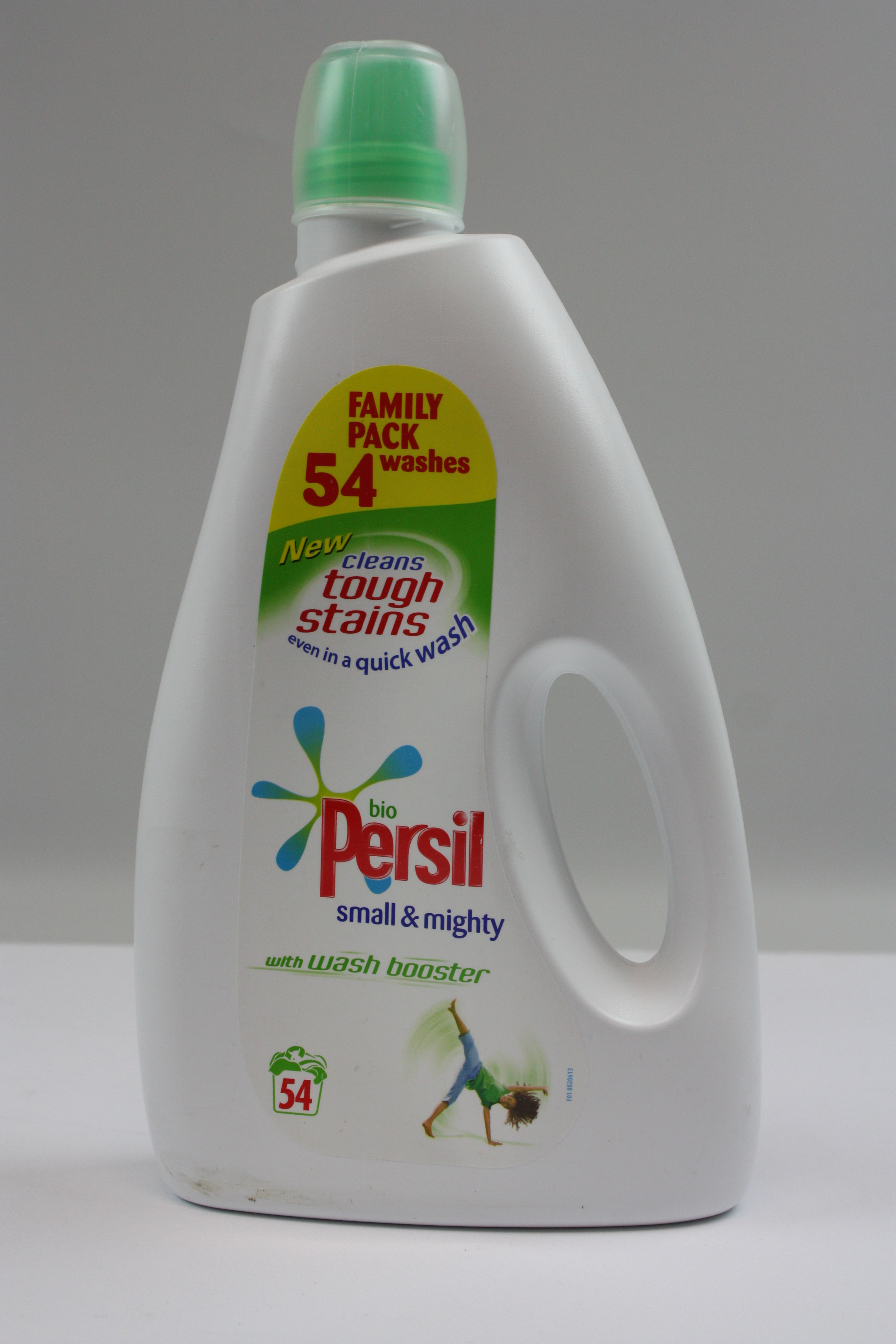 This is an image of a plastic bottle of Persil ‘Small and Mighty’ liquid from 2012. The design includes showing the number of washes that can be done by the contents of one bottle. The cap also includes a ‘dose’ so that the liquid can be accurately measured. What else do you notice about the design?