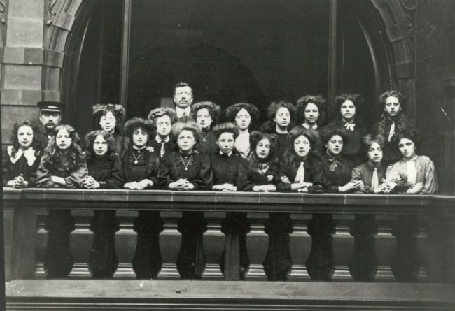 This photograph shows the staff of the Leeds Cross Arcade M&S Penny Bazaar c.1906. The manager was Mr Ratner (centre back). Fifth from right on the front row is Mrs Gertie Swidenbank (nee Nicholson) who worked in the tinware section of the M&S Penny Bazaar which opened in the Cross Arcade in 1904. Gertie is 14 in this picture, and most of the girls employed would start work at this age.