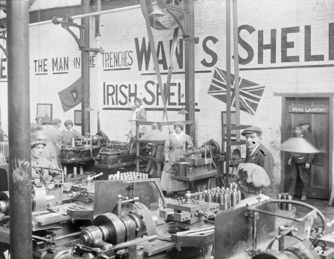 Lathe operators in the National Shell Factory at Parkgate Street, Dublin, during the First World War. Note the factory motto, 'The man in the trenches wants shells, Irish shells!' which is painted onto the wall
