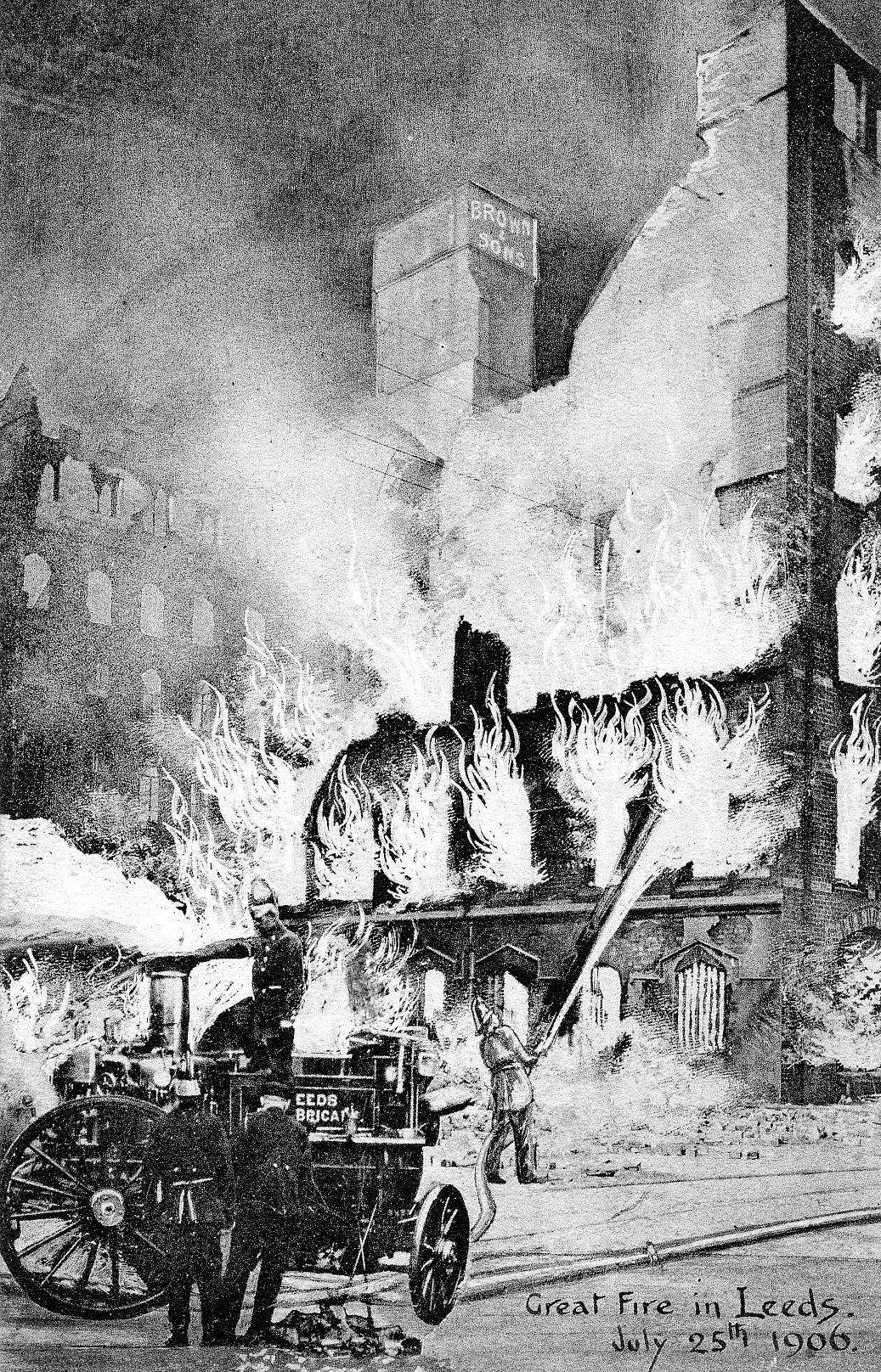 Postcard view of a fire in Leeds at 25 Wellington Street, at the junction with Thirsk Row. The fire brigade is shown trying to put out the fire. R.B Brown & Sons, Wholesale Clothiers & Woollen Merchants can be seen at 21 & 23 Wellington Street.
