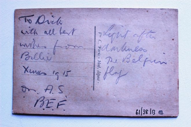 Back of the silk postcard decorated with the Royal Sussex Regiment, 8th Battalion badge. The handwritten message reads: ‘To Dick with all best wishes from Billie, Xmas 1915. Light after darkness, the Belgium flag. ON A.S. B.E.F. [On Active Service, British Expeditionary Force]’