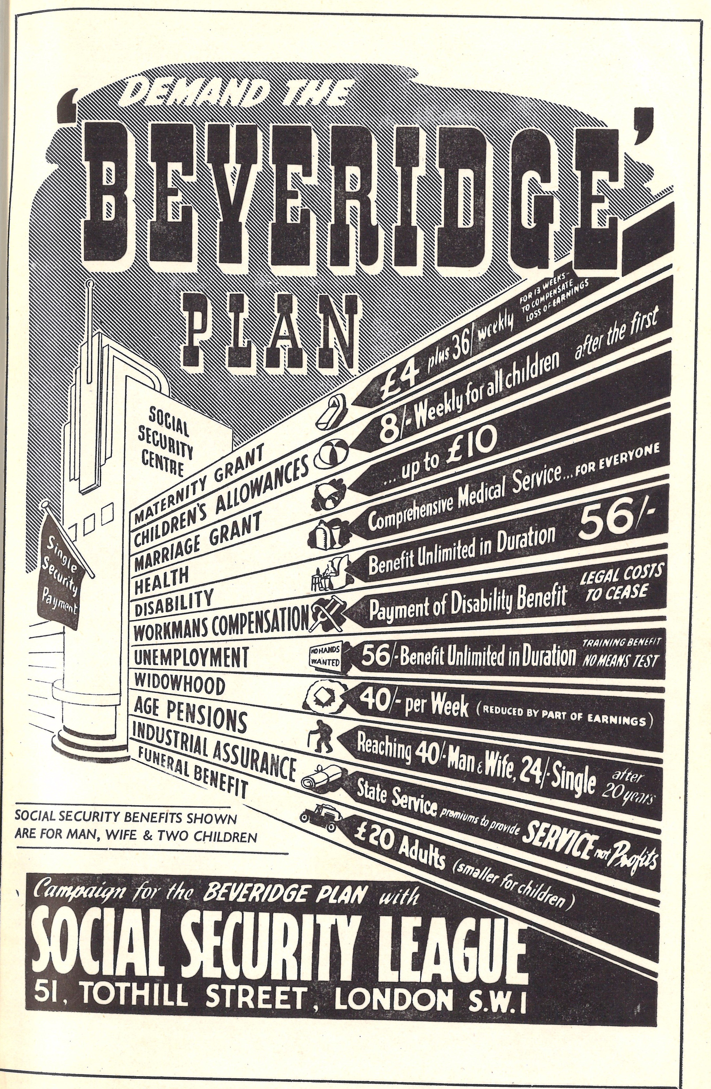 The poster sets out the main changes and provisions laid out in the Beveridge Report, including all the different benefits as well as National Insurance.