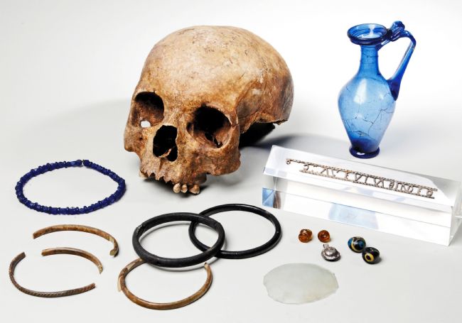 This female skeleton buried with her jewellery was found at York, in 1901 but it dates back much further. By examining her teeth, bones and facial features we learn that she may have been of mixed North African ancestry. We can also tell that this woman was wealthy, with international tastes. Her body was buried with a collection unusual and expensive jewellery, including glass earrings from Germany, and bangles of elephant ivory which probably came from Africa