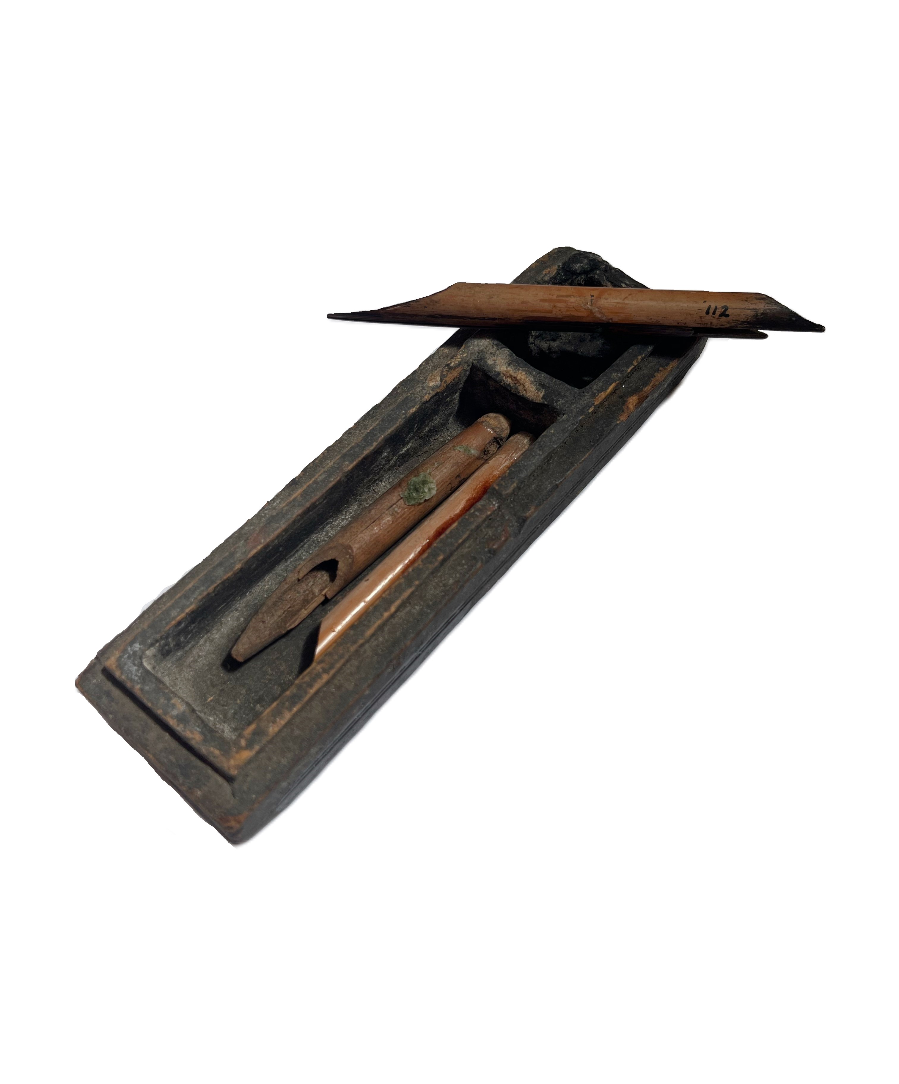 This small wooden object is an ancient Egyptian scribe’s box with compartments for ink and pens. It is designed to be portable and compact. The styli could be bone or wood and were used for stratching into wax or other surfaces. Writing was very important to the ancient Egyptians and they have left a vast amount of written material. The written word was sacred and believed to have magic power. The Book of the Dead was placed in a person’s tomb and contained all the spells and prayers that were needed to ensure the deceased would have a long and comfortable afterlife.