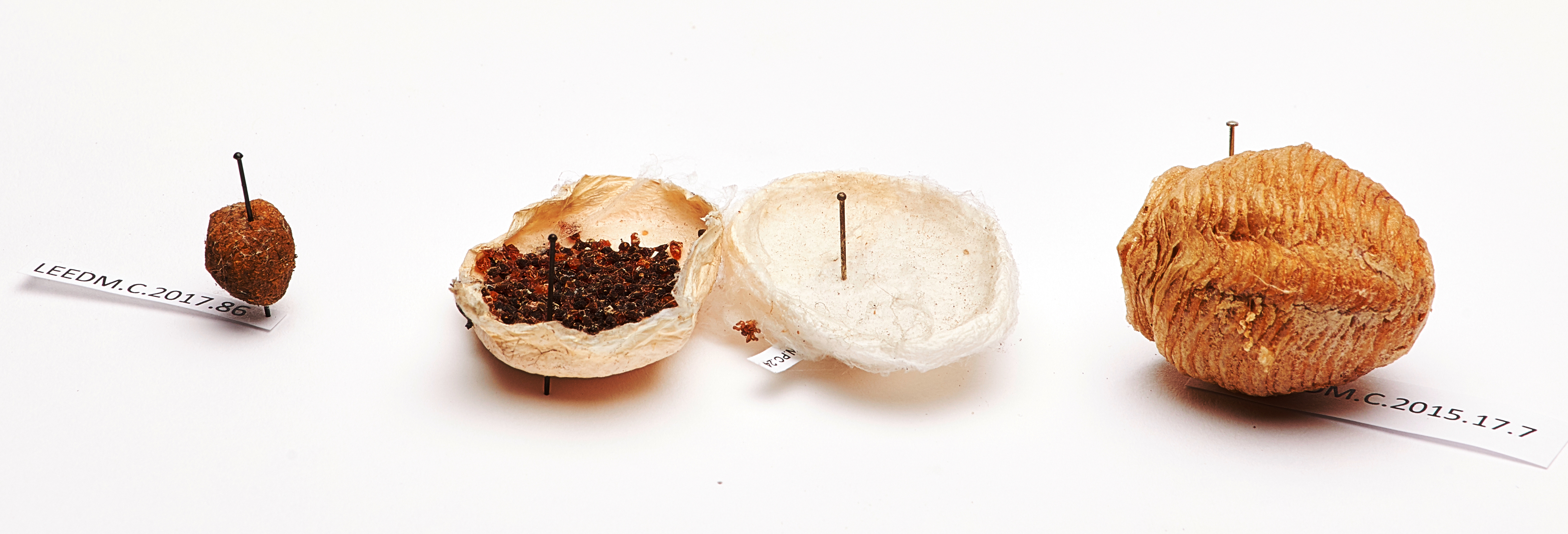 Spider egg sacs (left and middle) and Mantis ootheca (right)