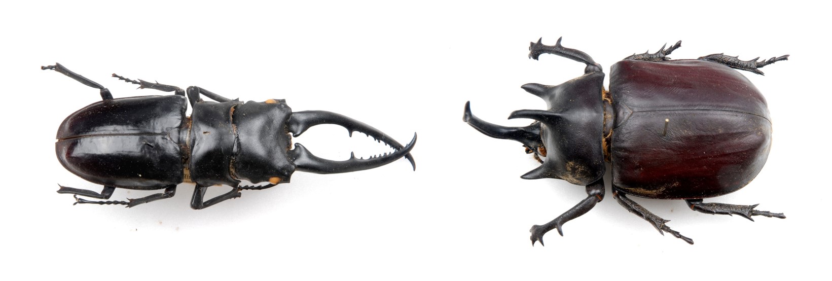 Rhino beetles and Stag Beetles (Dynastinae and Lucanidae) have large horn-like structures that they use for fighting other males over mates and territory.